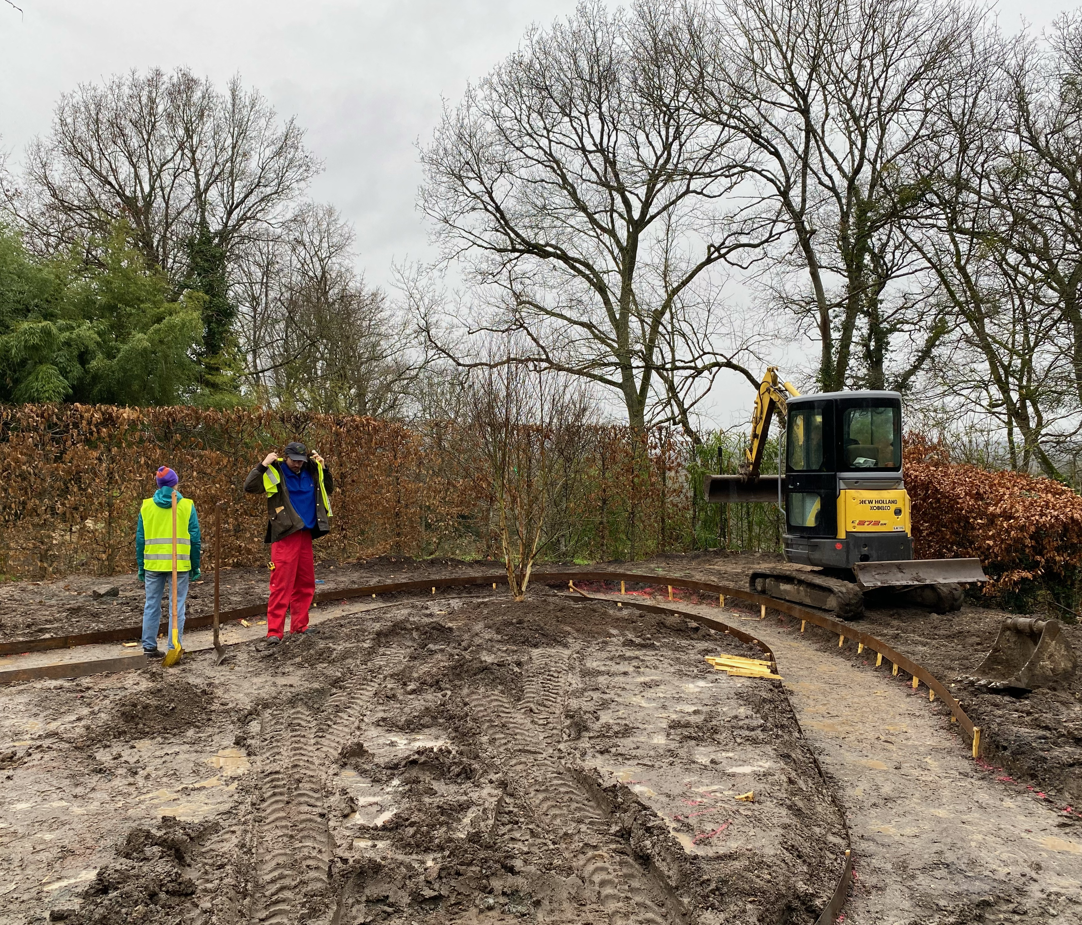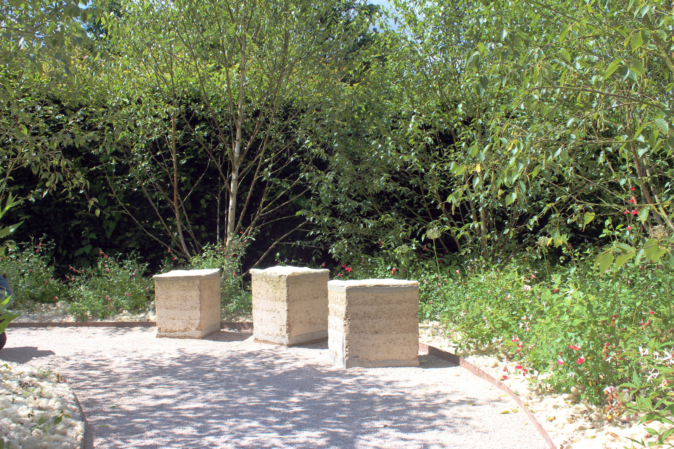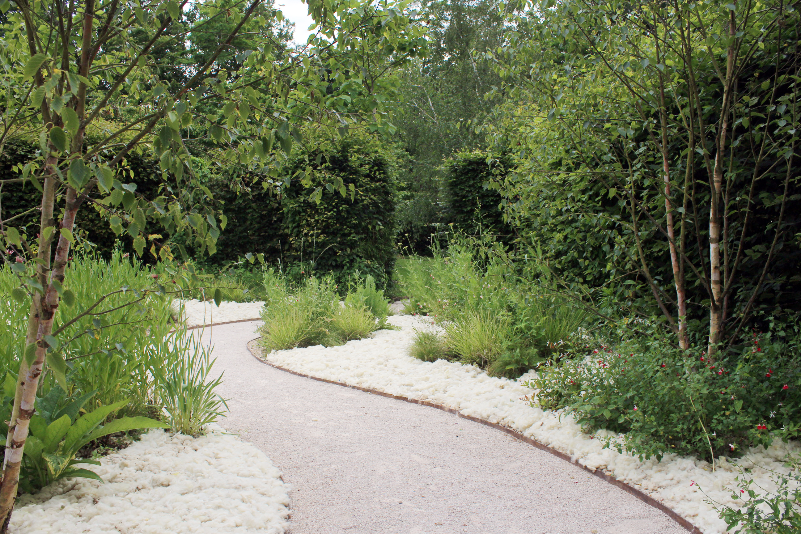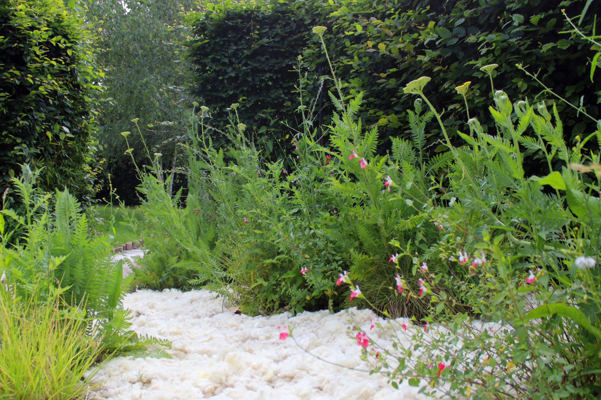Souvent considérée comme un déchet physique et un poids économique par les éleveurs, la laine de mouton issue des tontes annuelles peut constituer un paillage vertueux et performant. L'atelier GABU et Manon Jacob ont récupéré auprès d'un éleveur de Béard dans la Nièvre et de Quentin – un éleveur voisin de notre atelier dans le Cher – la tonte de troupeaux d'eco-pâturage. Naturelle et biodégradable, la laine peut retenir 30% de son poids en eau sans être humide. Manteau isolant pour les gels tardifs et régulateur hygrométrique et thermique lors des fortes chaleurs du plein été, elle représente aussi un apport d'azote et de phosphore pour l'activité biologique des sols. Selon les zones et la végétation du jardin, nous avons laissé la laine brute ou l'avons cardé ou feutré à la main ; trois assises en pisé ont également été réalisées pour permettre un temps de pause lors du parcours.