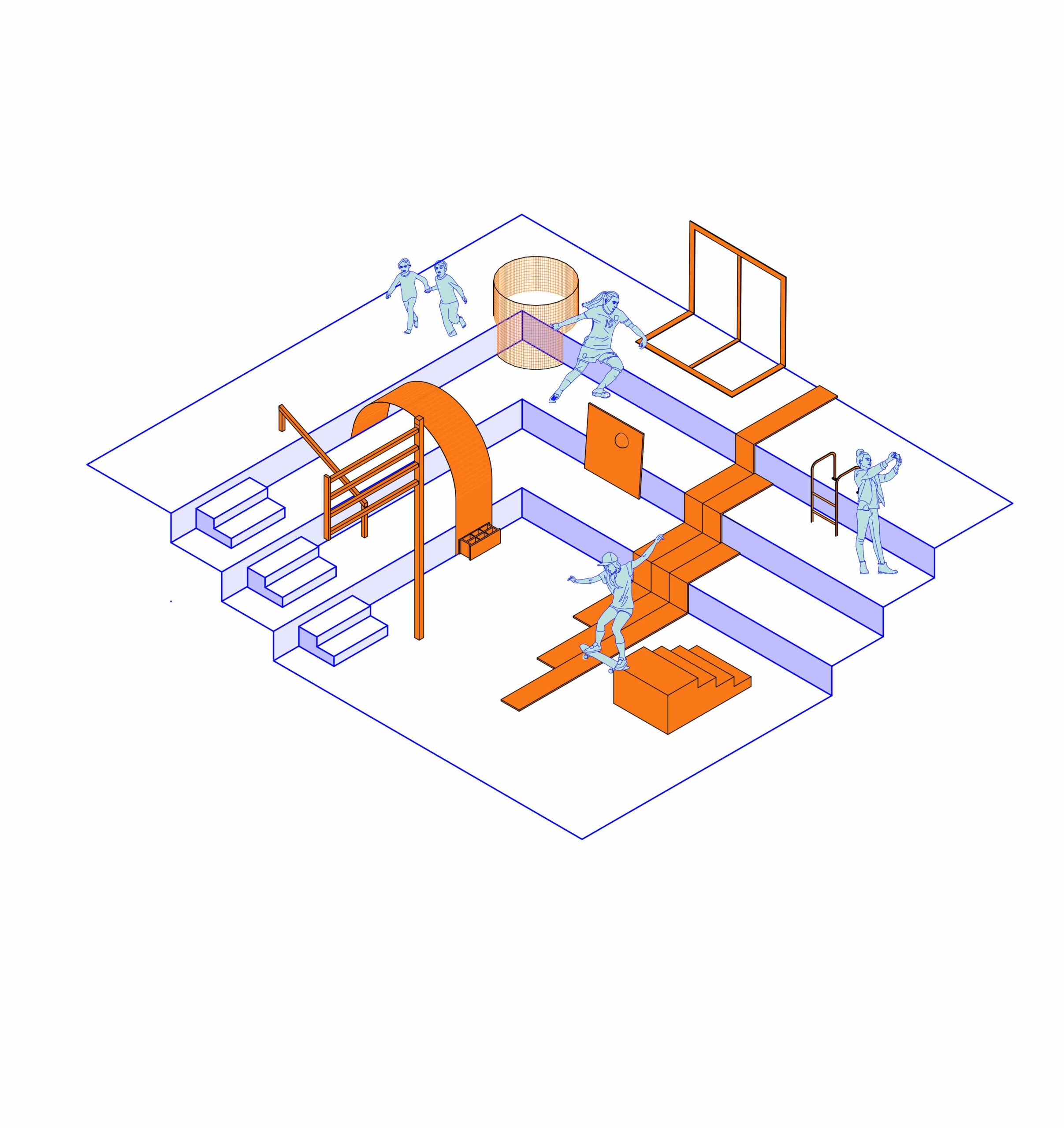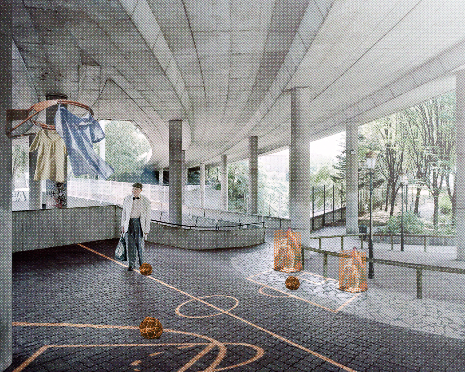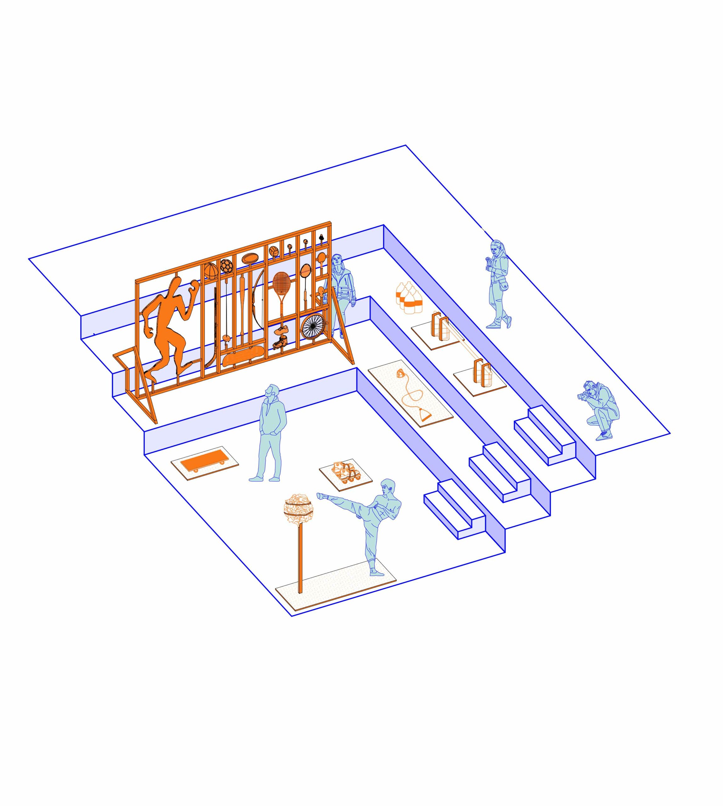 Le projet met en récit et en scène une proposition d’exposition sur « Le sport dans la ville de demain » proposée par le site Le Corbusier à Firminy en 2022. L’enjeu est de s’approprier le sujet et de l’interpréter au travers d’une exposition et la conception de ses installations artistiques dans le centre culturel du Site Firminy. Cette scénographie présente le récit collectif qu’est et doit devenir le sport dans la ville, de ses joies et ses urgences sociétales. Certains dispositifs sont des représentations, symbologies et hommages, d’autres des interrogations vers une histoire collective qui a besoin d’être visionnaire. Ce projet d’exposition parle de célébration collective, de fête, de l’individu face aux infrastructures, de poésie urbaine, d’urgence et de repos.