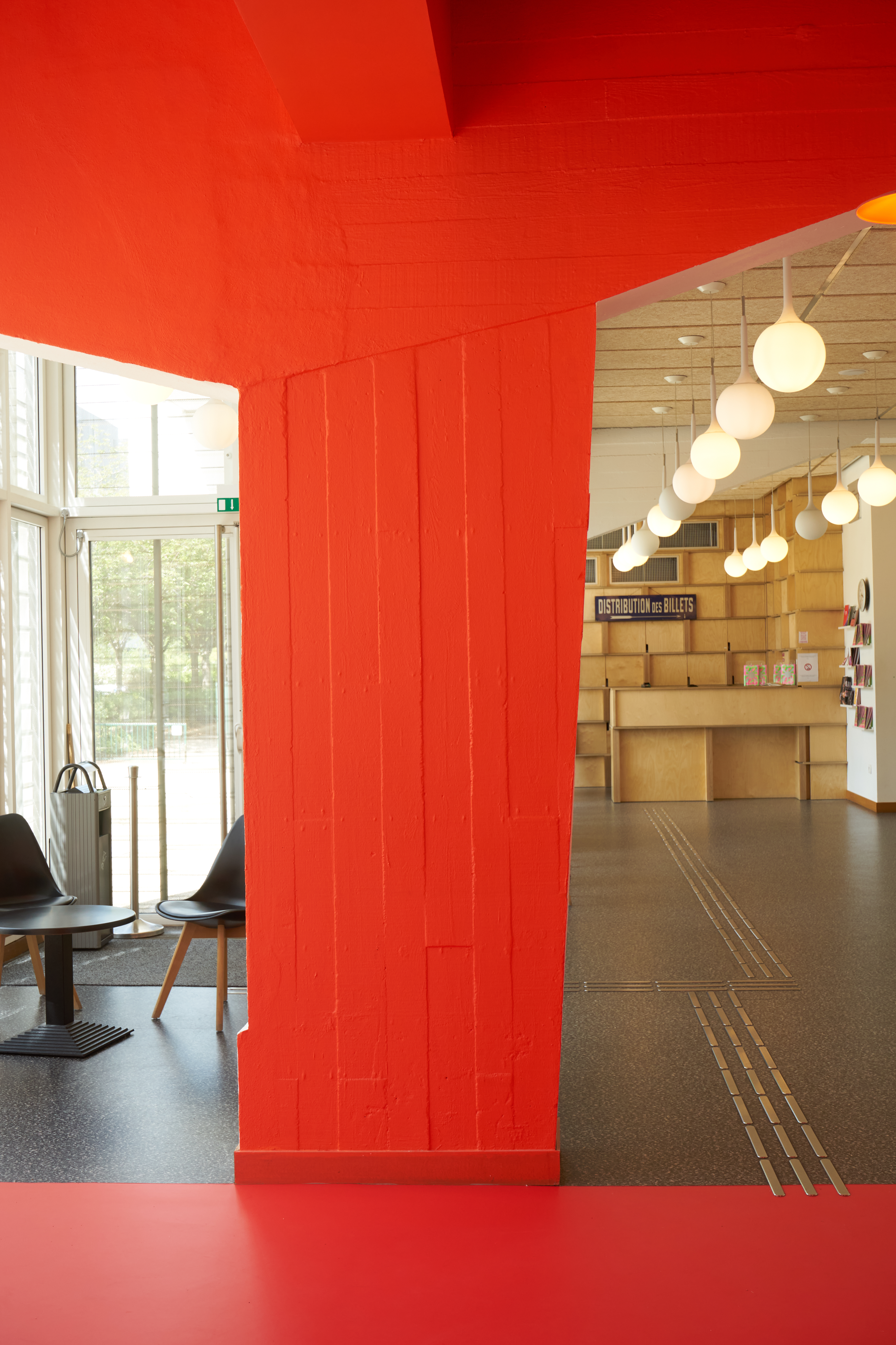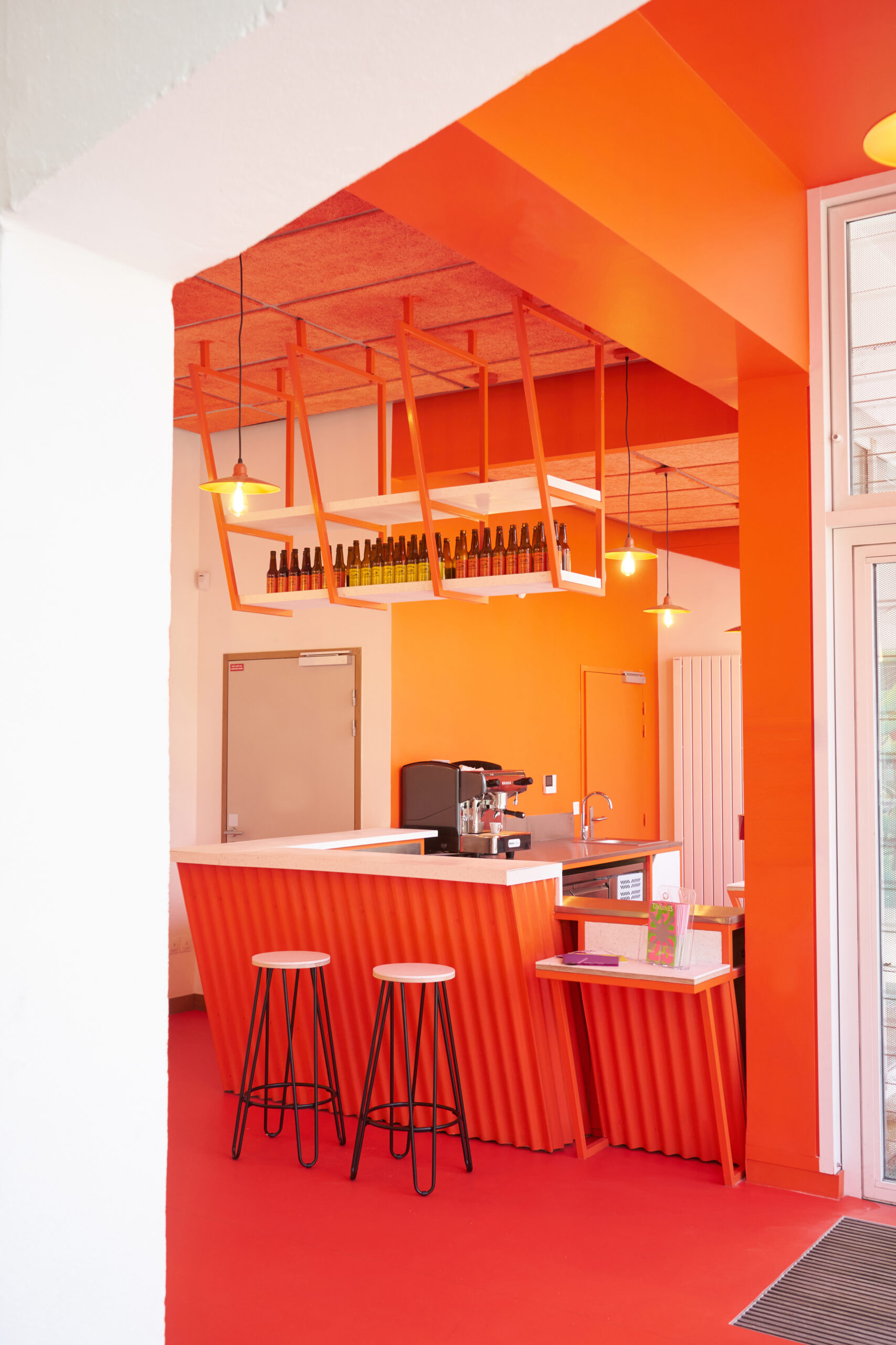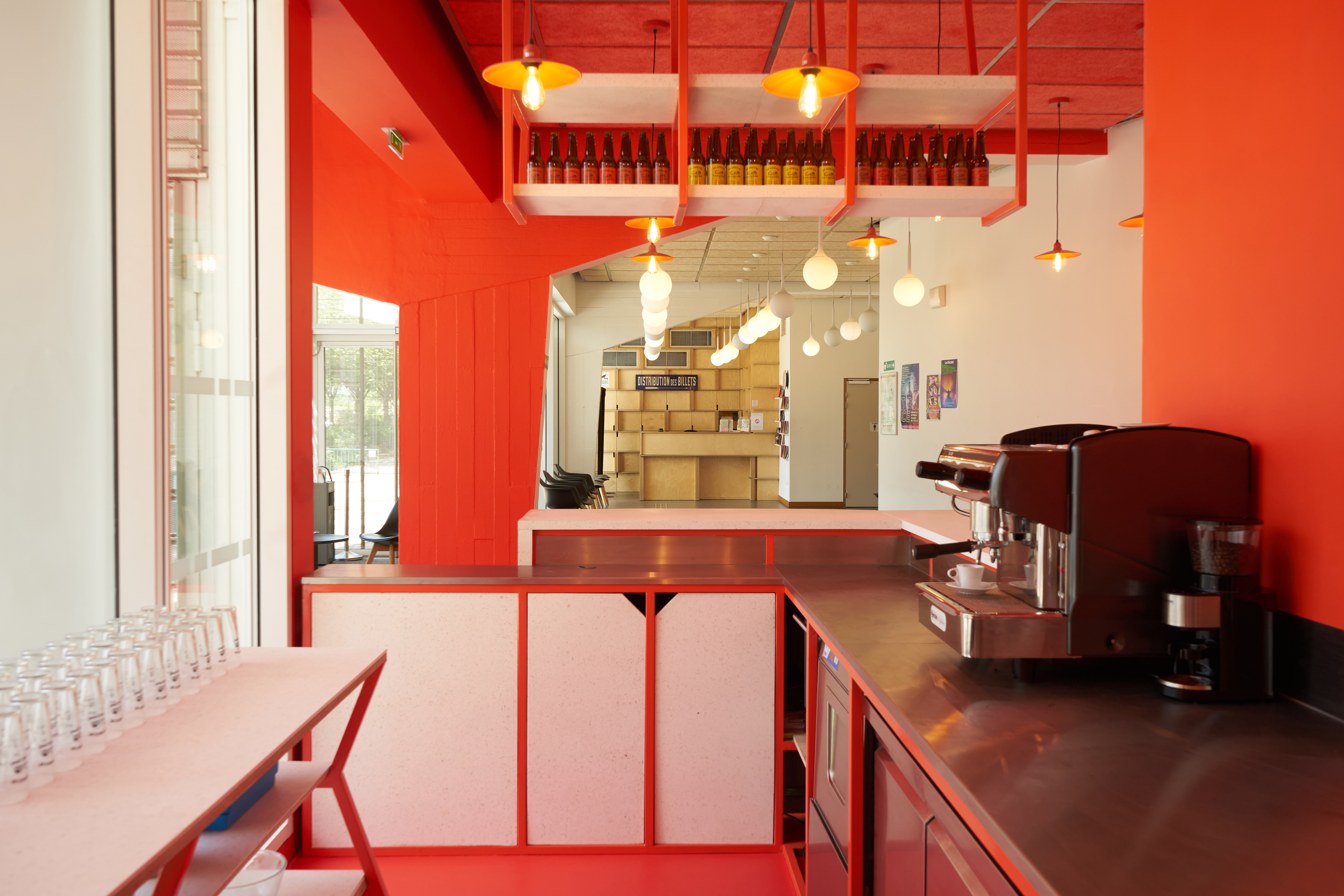 Dans le hall d'accueil d'un théâtre public, l'atelier GABU démolit un vieux local pour aménager un bar d'appoint pour boire un verre avant/après les pièces. Avec un budget très serré le projet créé un espace enthousiaste et mieux défini. L’aménagement se colore d'une même teinte pour en préciser le cadre et les limites. Le projet met en œuvre métal et revêtements en plastique recyclé.