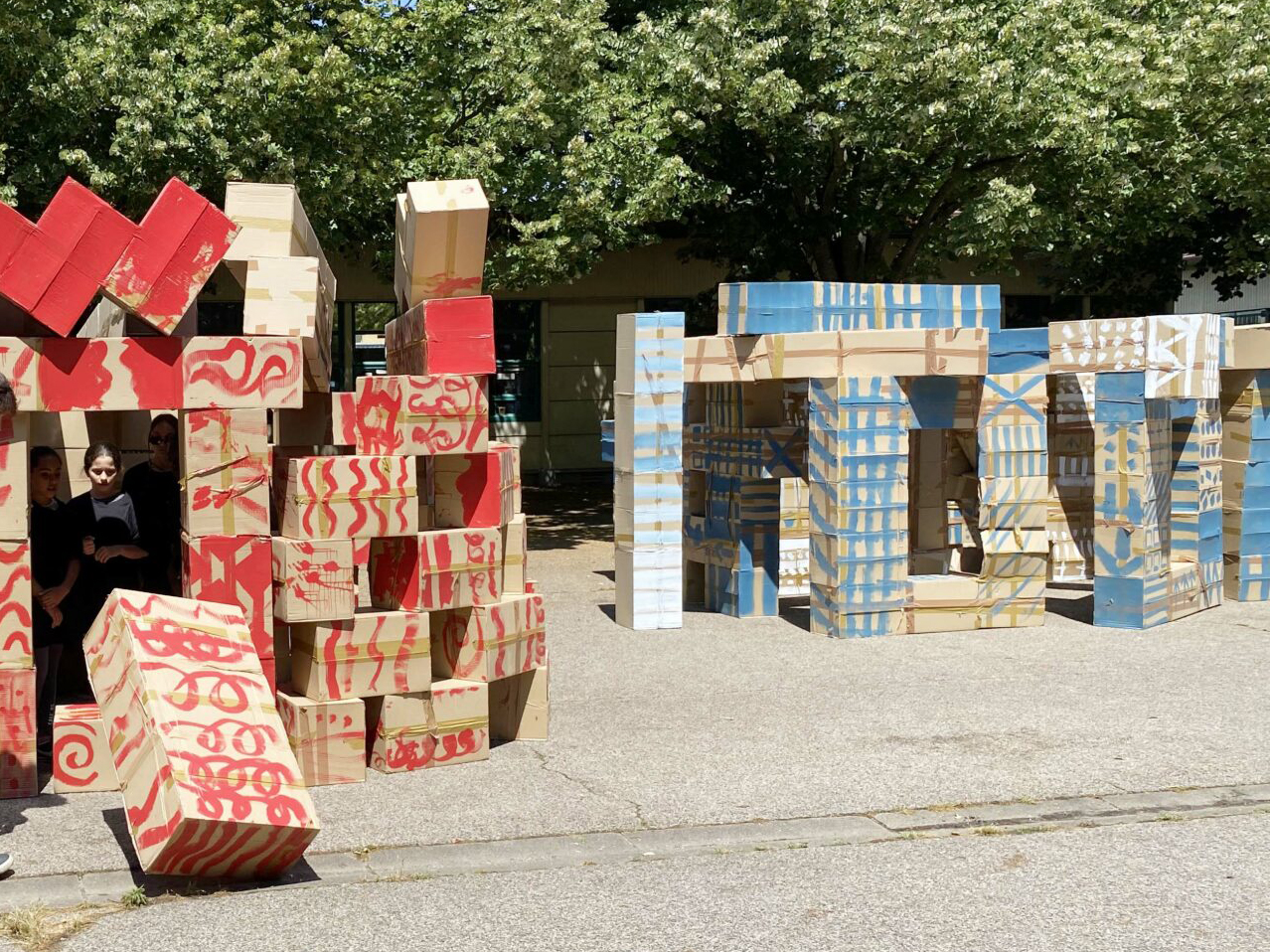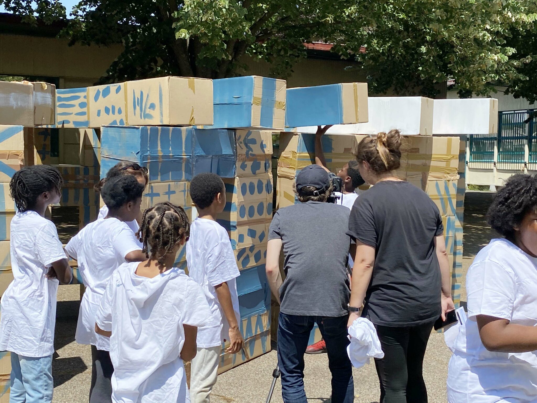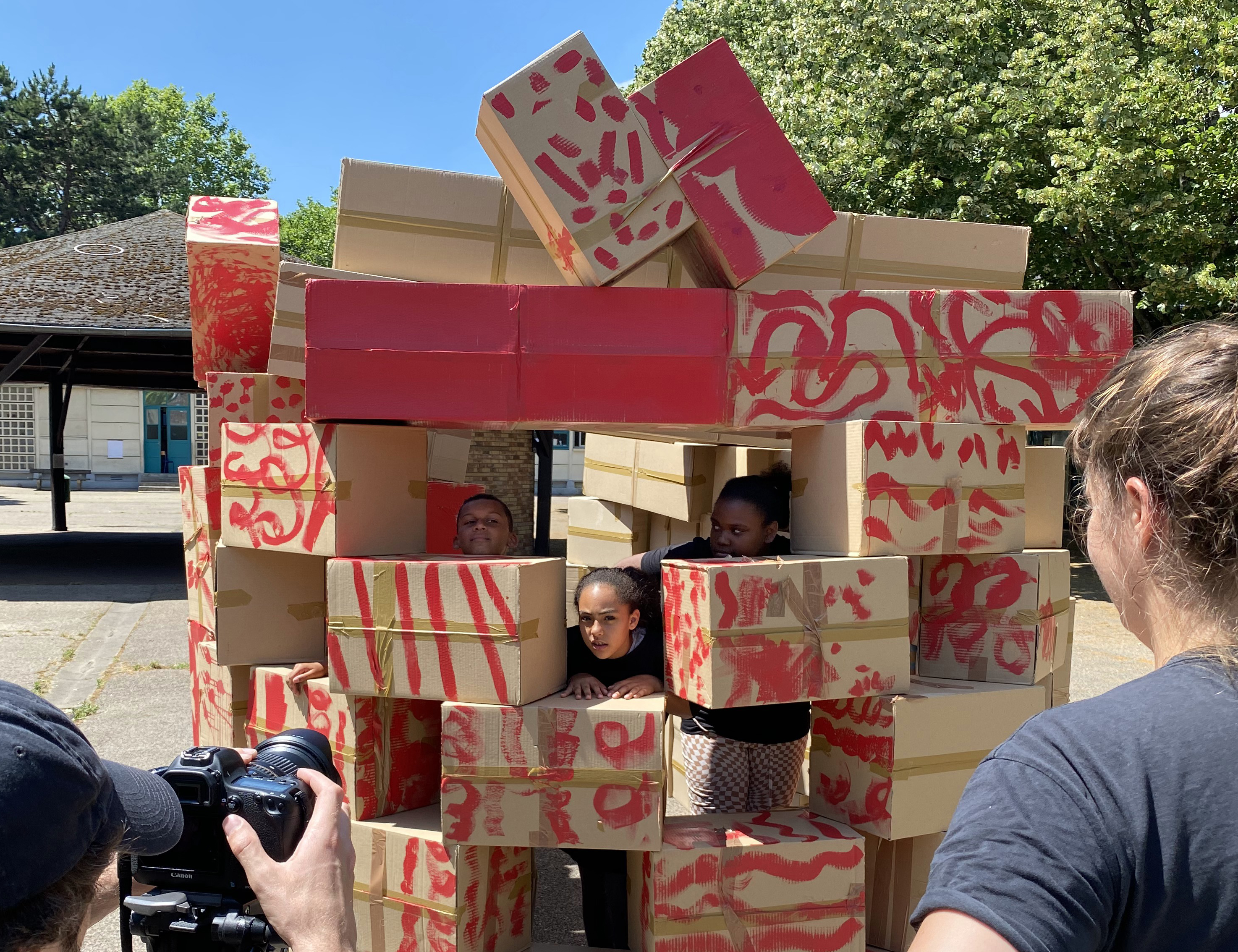 À partir de boîtes en carton assemblées issues du réemploi et formant chacune une unité de construction rapide à mettre en œuvre, les enfants ont construit autant d’espaces, de structures architecturées, d’urbanités et de lieux qui ont fondé leur société inconsciente. Chaque temps de transmission a vu cette œuvre mouvante grandir et changer chaque fois comme un chantier collectif et évolutif.