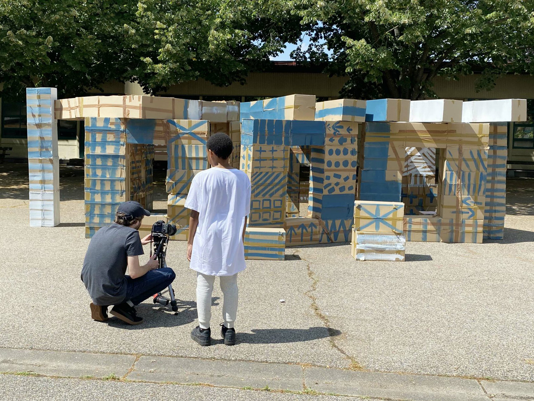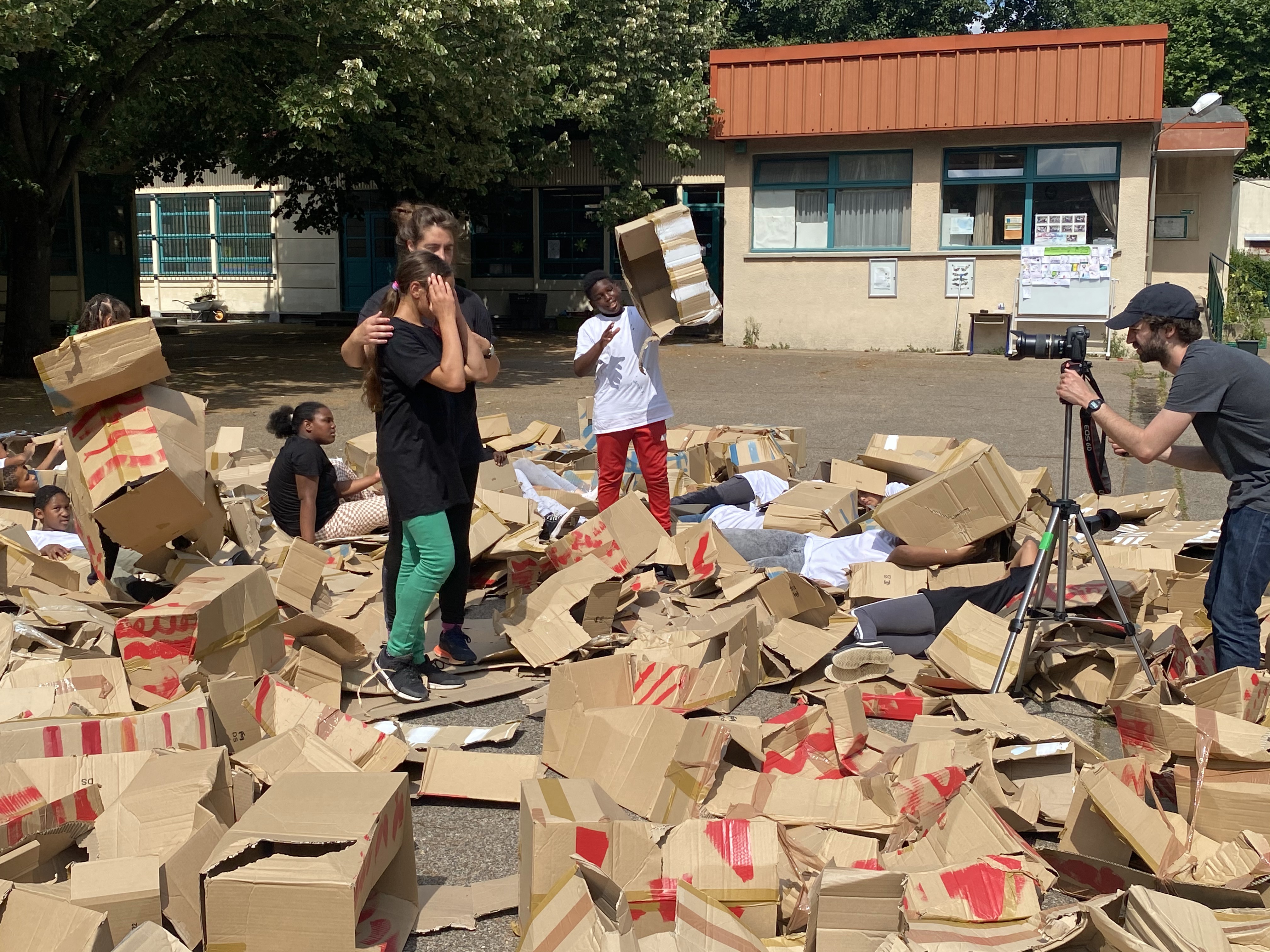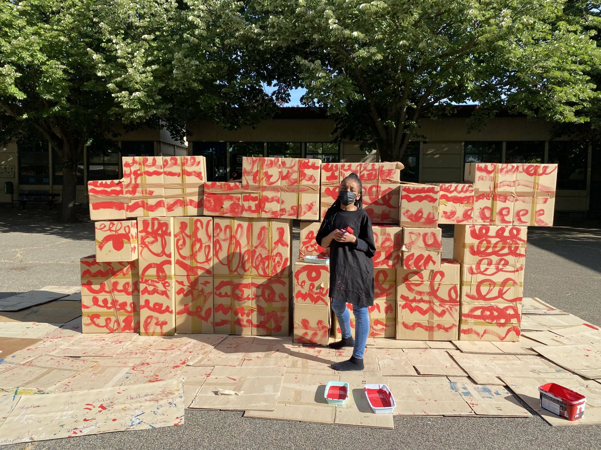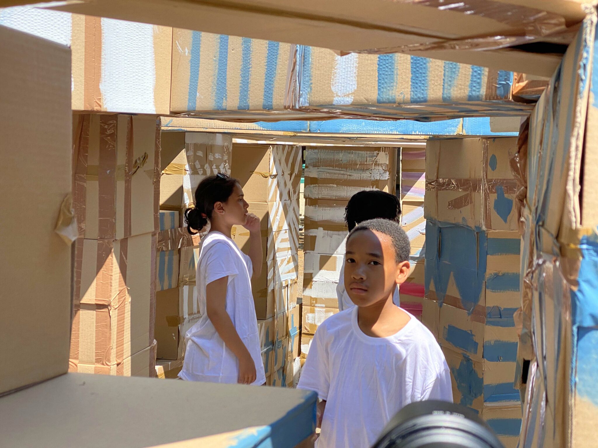 À partir de boîtes en carton assemblées issues du réemploi et formant chacune une unité de construction rapide à mettre en œuvre, les enfants ont construit autant d’espaces, de structures architecturées, d’urbanités et de lieux qui ont fondé leur société inconsciente. Chaque temps de transmission a vu cette œuvre mouvante grandir et changer chaque fois comme un chantier collectif et évolutif.