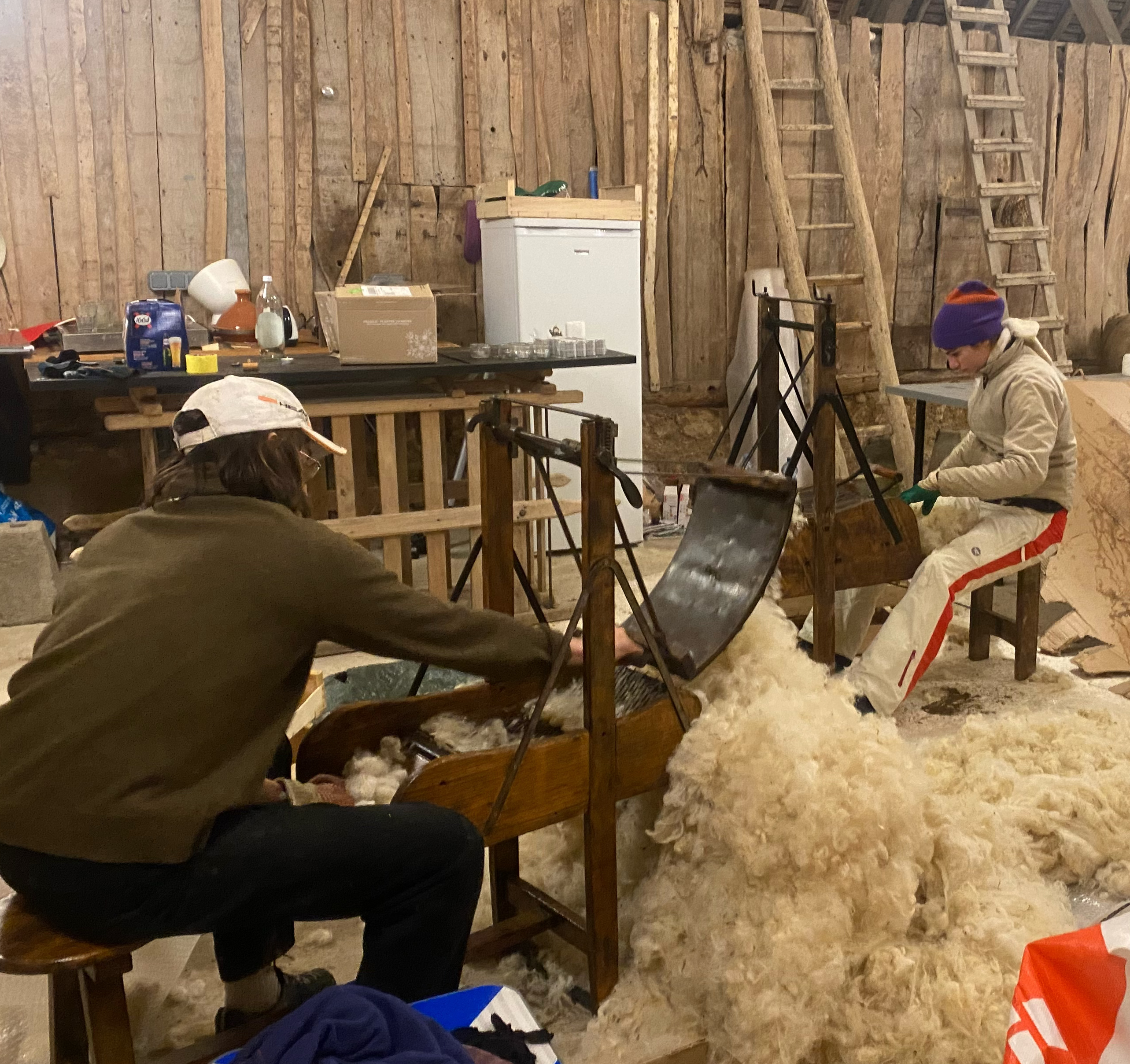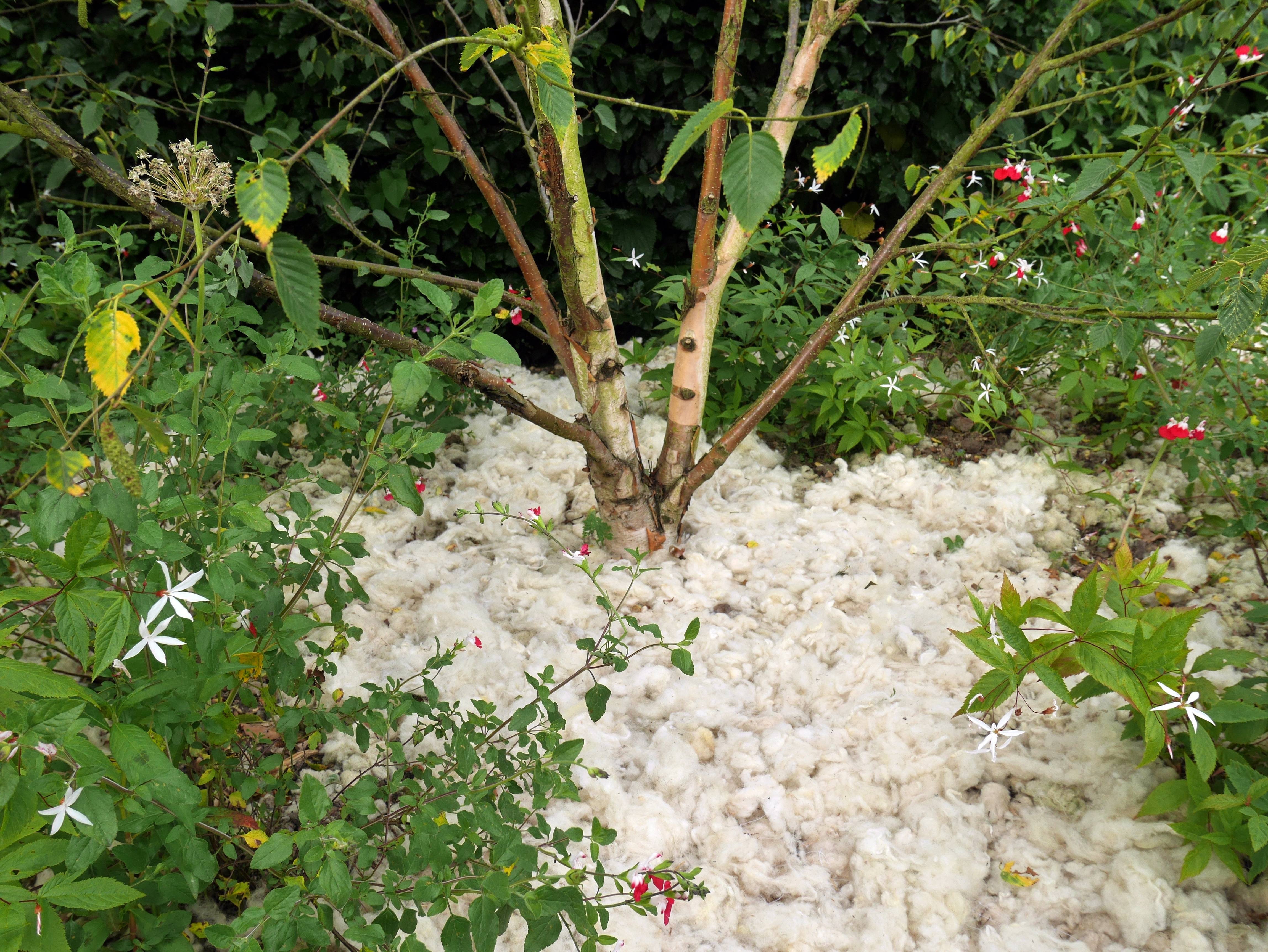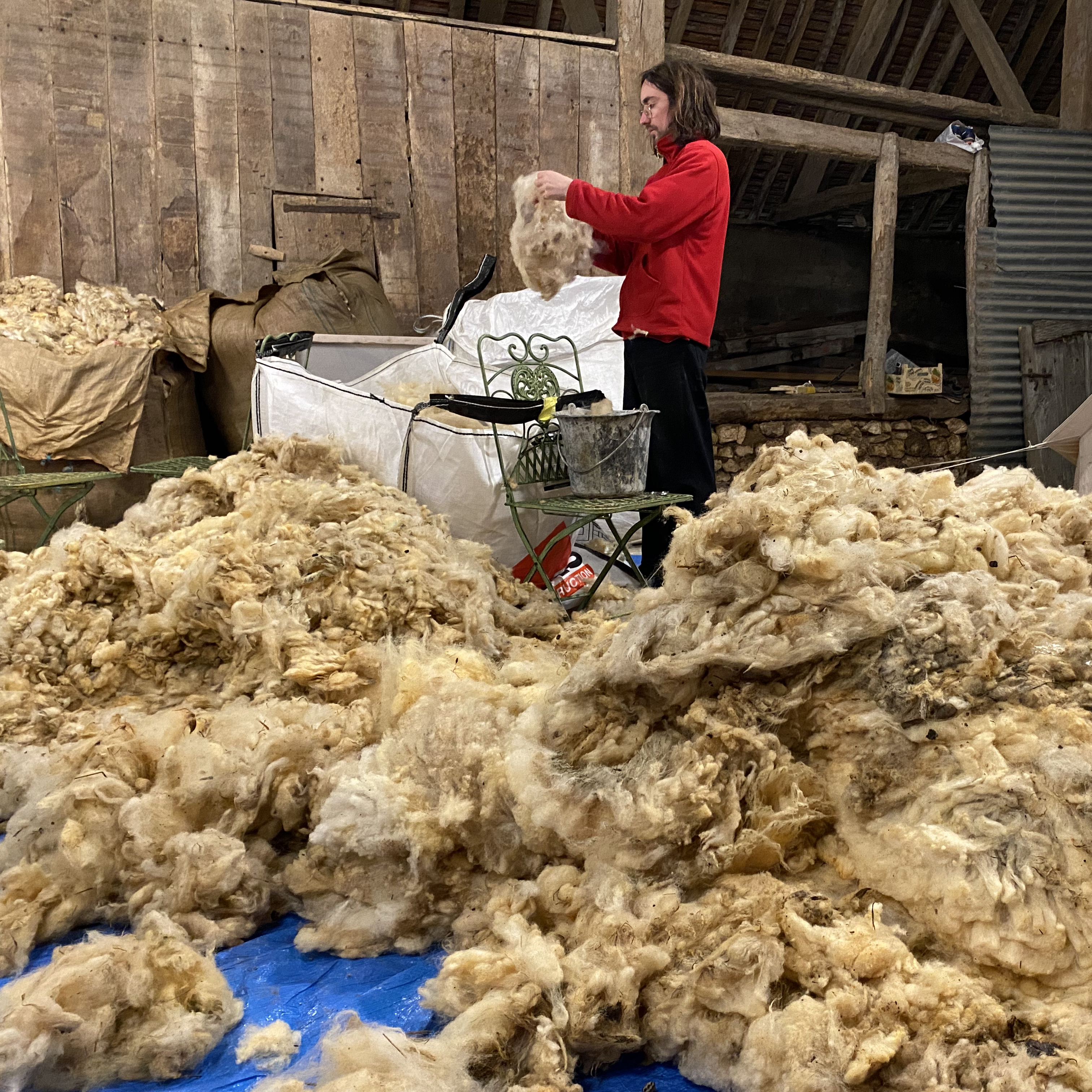 Souvent considérée comme un déchet physique et un poids économique par les éleveurs, la laine de mouton issue des tontes annuelles peut constituer un paillage vertueux et performant. L'atelier GABU et Manon Jacob ont récupéré auprès d'un éleveur de Béard dans la Nièvre et de Quentin – un éleveur voisin de notre atelier dans le Cher – la tonte de troupeaux d'eco-pâturage. Naturelle et biodégradable, la laine peut retenir 30% de son poids en eau sans être humide. Manteau isolant pour les gels tardifs et régulateur hygrométrique et thermique lors des fortes chaleurs du plein été, elle représente aussi un apport d'azote et de phosphore pour l'activité biologique des sols. Selon les zones et la végétation du jardin, nous avons laissé la laine brute ou l'avons cardé ou feutré à la main ; trois assises en pisé ont également été réalisées pour permettre un temps de pause lors du parcours.