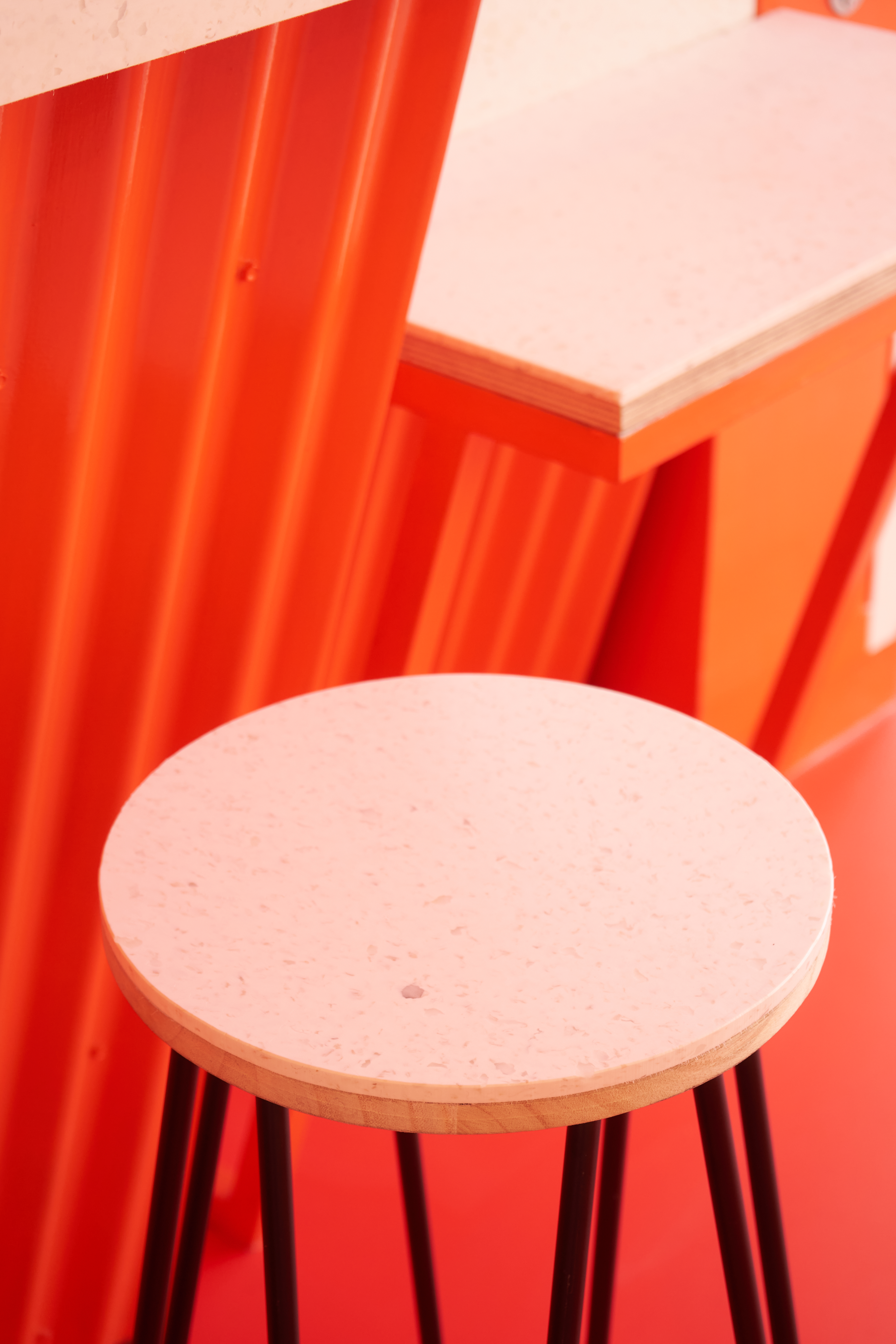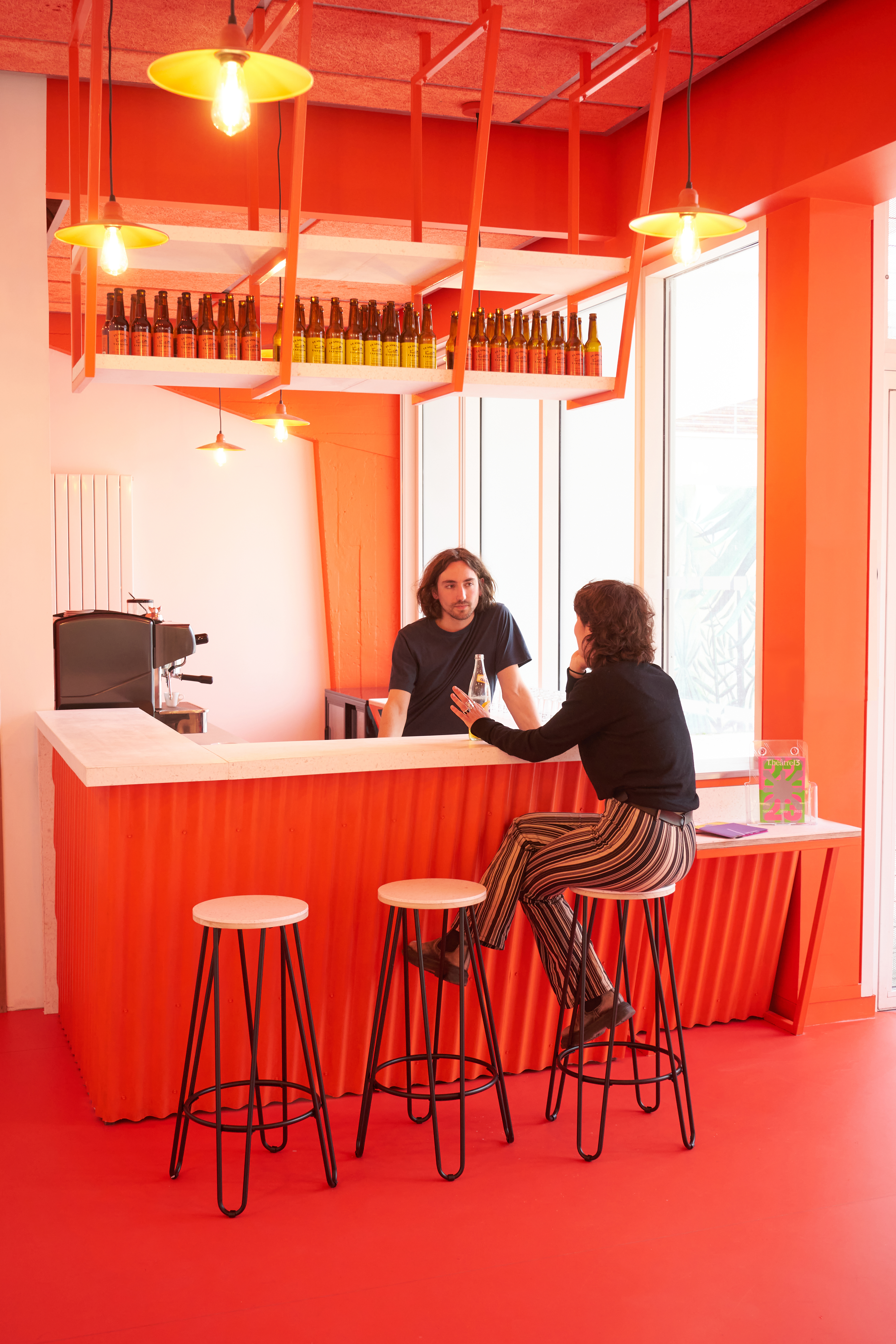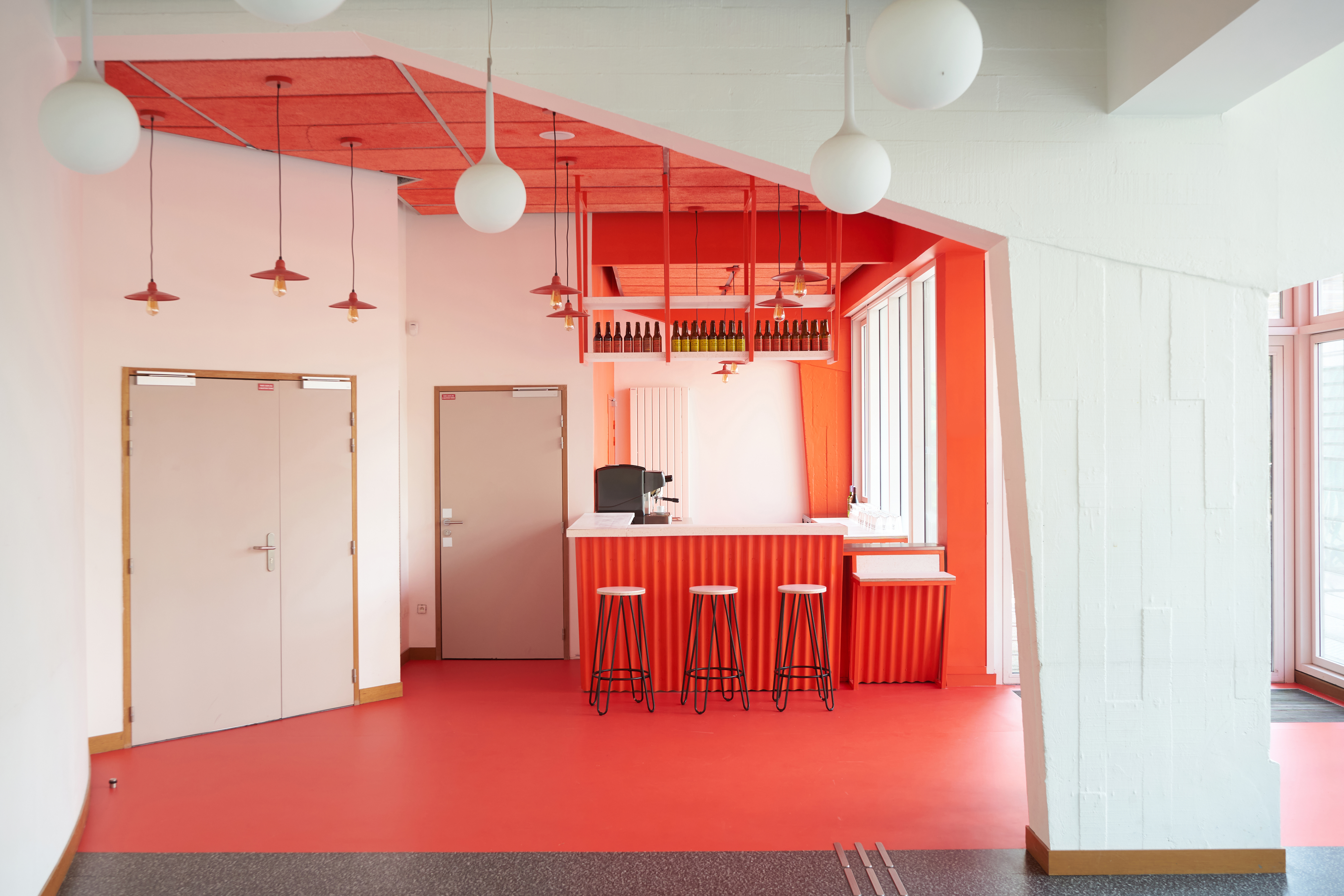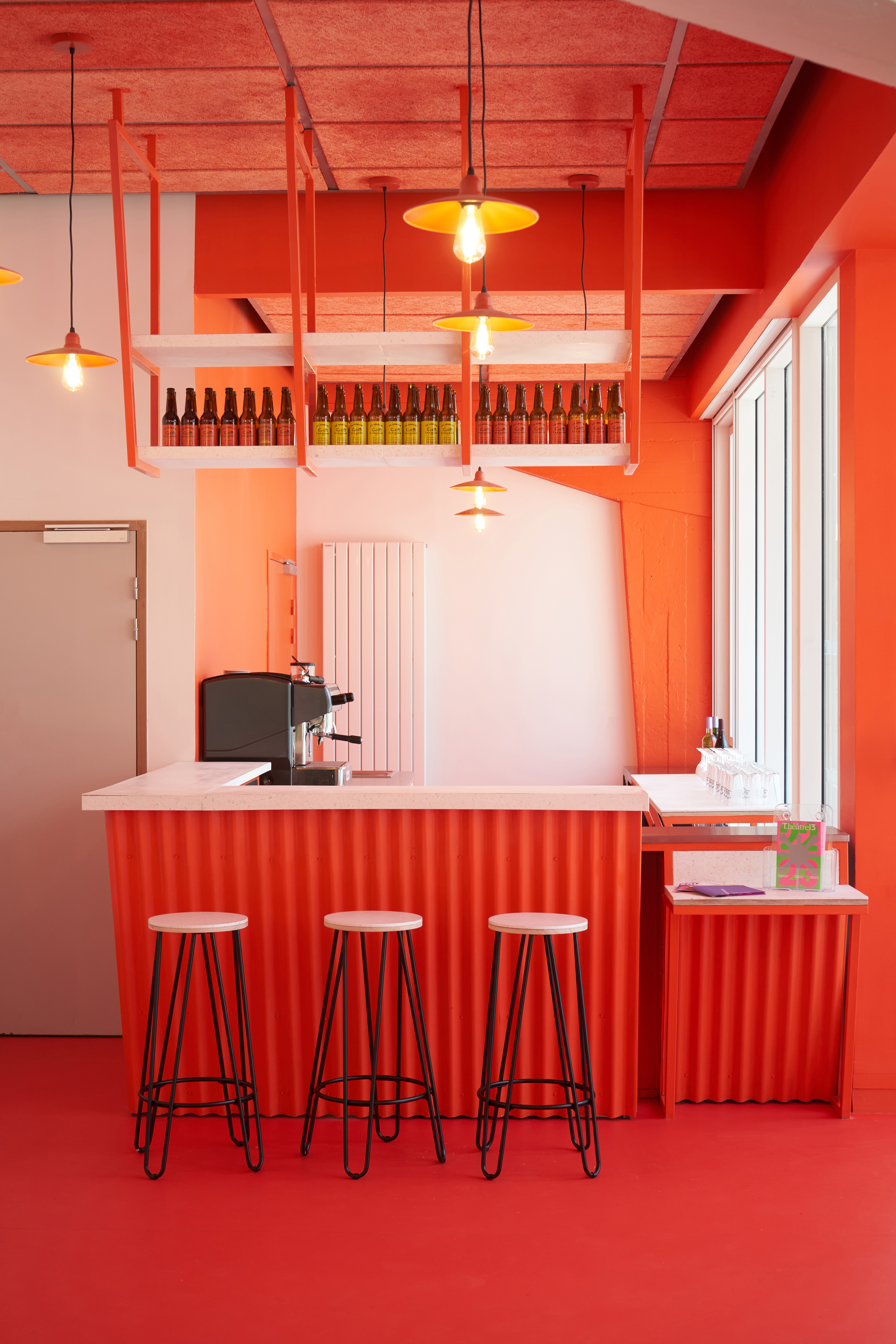 Dans le hall d'accueil d'un théâtre public, l'atelier GABU démolit un vieux local pour aménager un bar d'appoint pour boire un verre avant/après les pièces. Avec un budget très serré le projet créé un espace enthousiaste et mieux défini. L’aménagement se colore d'une même teinte pour en préciser le cadre et les limites. Le projet met en œuvre métal et revêtements en plastique recyclé.