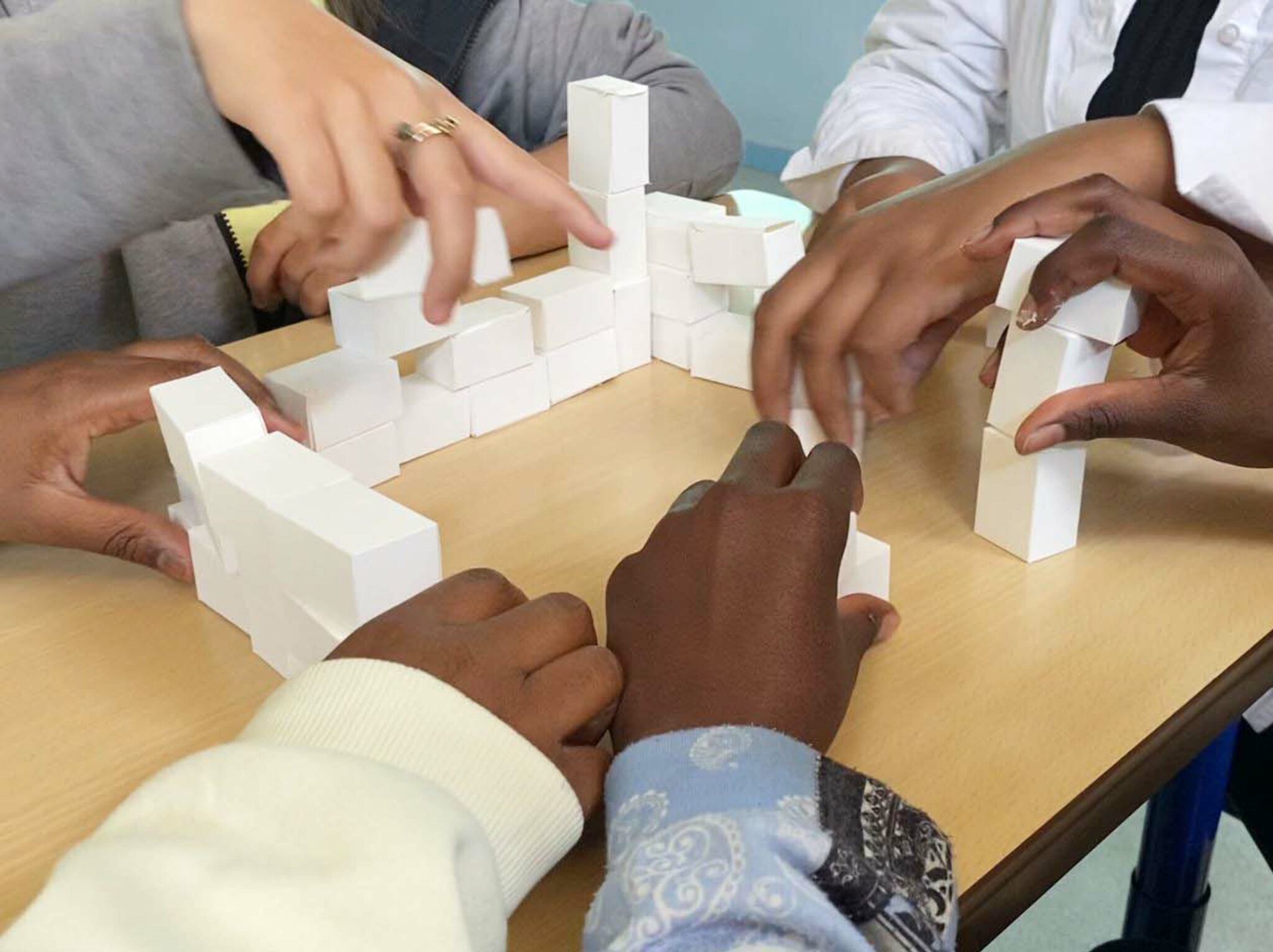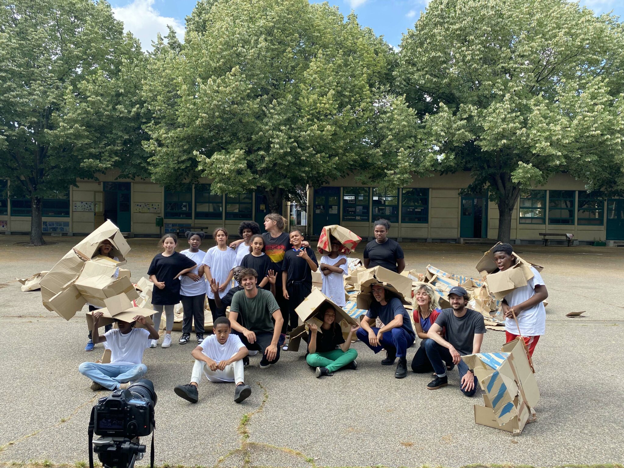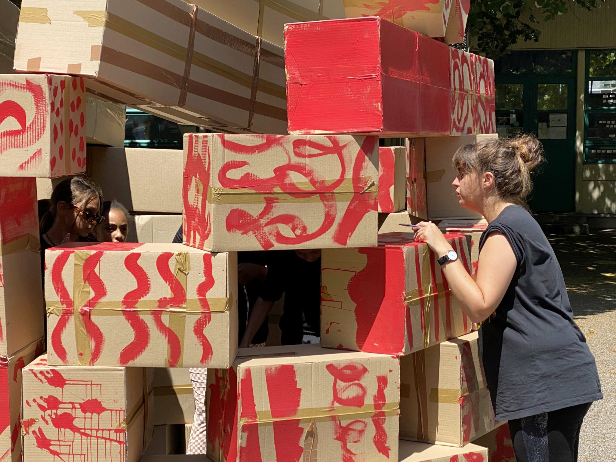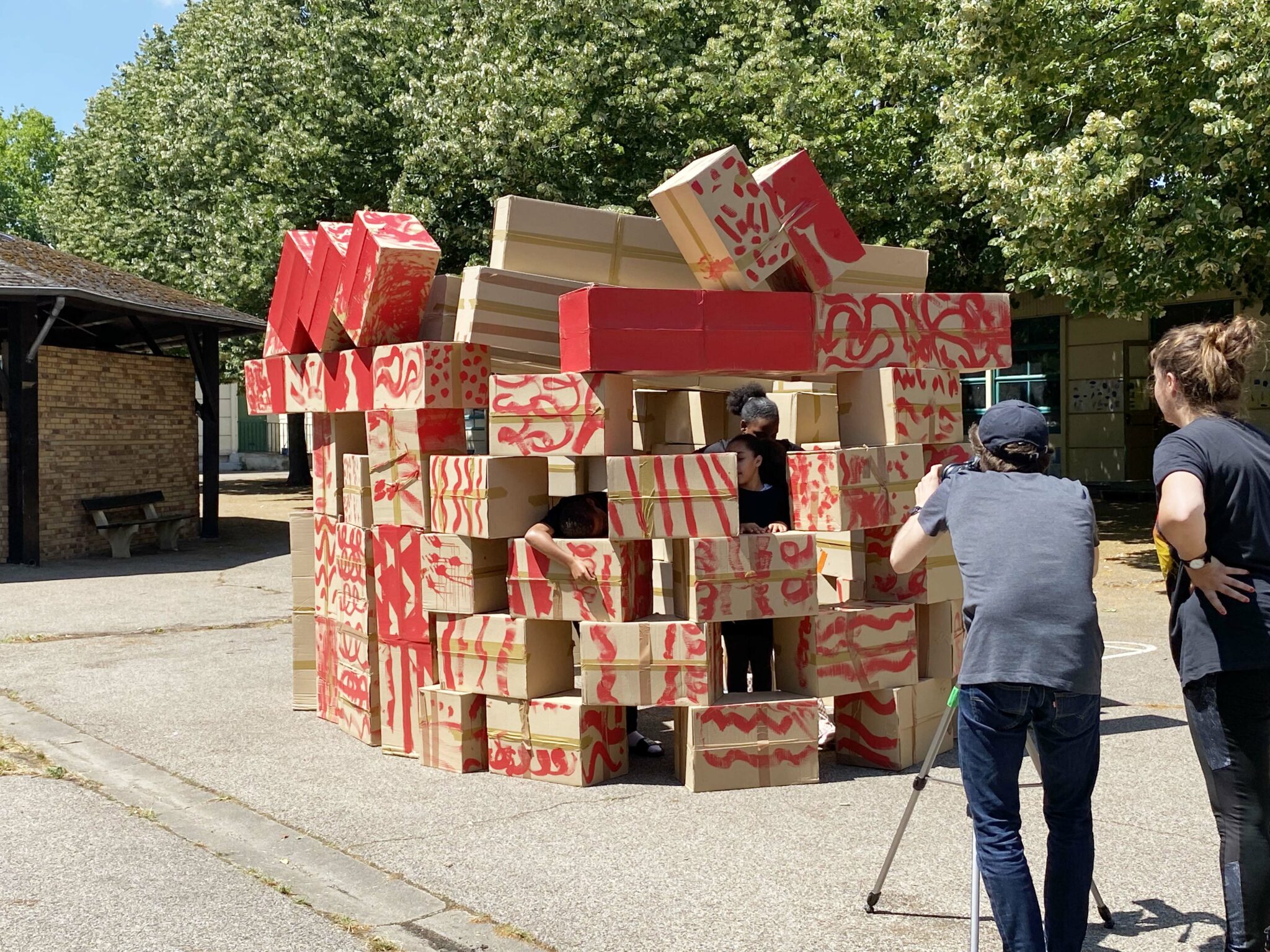À partir de boîtes en carton assemblées issues du réemploi et formant chacune une unité de construction rapide à mettre en œuvre, les enfants ont construit autant d’espaces, de structures architecturées, d’urbanités et de lieux qui ont fondé leur société inconsciente. Chaque temps de transmission a vu cette œuvre mouvante grandir et changer chaque fois comme un chantier collectif et évolutif.